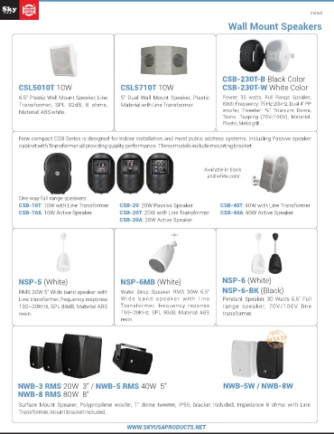 RMS 20W 5” Wide band speaker with Line transformer, Water Drop Speaker RMS 30W 6.5” Wide band speaker with 6.5” Plastic Wall Mount Speaker, Line Transformer, SPL 5” Dual Wall Mount Speaker, Plastic Material with Line New compact CSB Series is designed for indoor installation and most public address systems. Including Passive speaker
