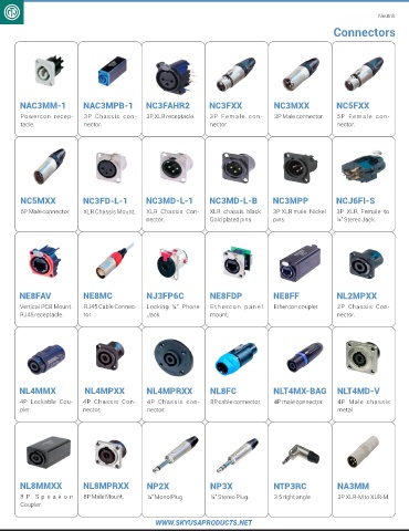 Powercon recep- 3P Chassis con- 3P XLR receptacle. 3P Female con- 3P Male connector. 5P Female con- 3P XLR-F to XLR-F. 3P XLR-F to 5P XLR- Ethercon Shielded & 3P- F Receptacle. 3P-M Receptacle. HC Powercon.
