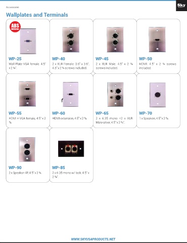 Panel Set / 3 spaces. 4.5” x Terminal 3 RCA Jack. Terminal XLR male. Terminal 2 RCA Jack. Wall Plate VGA female. 4.5” 2 x XLR Female. 3.6” x 3.6”, 2 x XLR Male. 4.5” x 2 ¾ HDMI. 4.5” x 2 ¾ screws