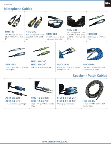 20ft XLR female to ¼”mono XLR-F to ¼” Mono Plug Gold. XLR-M to XLR-F 20ft Nylon 20ft Nylon Microphone Cable